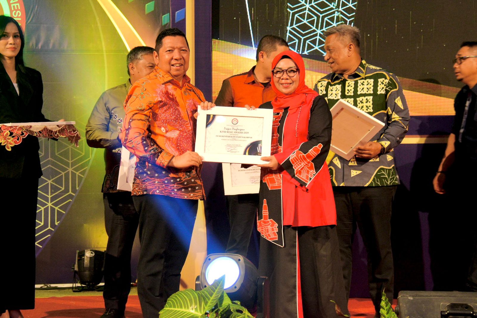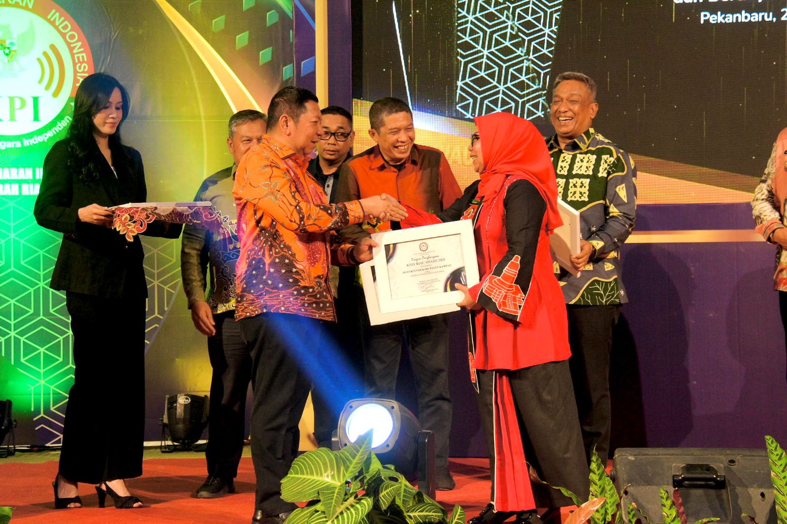 Pekanbaru — Mewakili Bupati Kampar Ahmad Yuzar S.Sos, MT, Wakil Bupati Kampar Dr Misharti S.Ag M.Si didampingi Plt Kadis Kominfo Kampar Zulfikar S.Ag M.Si, Kabid Pengembangan Sumber Daya Layanan Publikasi (PSDLP) Salmi Hadi, S. Sos, M Si, Kabid Pengelolaan Informasi Komunikasi Publik Bambang, M. Si menghadiri kegiatan KPI Riau Award 2025 yang diselenggarakan oleh Komisi Penyiaran Indonesia Daerah (KPID) Riau dengan mengusung tema “Siaran Cerdas Berbudaya dan Berdaya Saing di Era Digital”. Kegiatan yang dilaksanakqn di gedung Graha Pena Riau Pos tersebut bentuk apresiasi bagi lembaga penyiaran, tokoh, dan pemerintah daerah yang dinilai berkontribusi dalam meningkatkan kualitas penyiaran di Provinsi Riau. Rabu malam (26/11/2025). Kegiatan tersebut dihadiri oleh Gubernur Riau yang diwakili Asisten I Setda Riau Zulkifli Syukur, Pimpinan Penyiaran Publik, pelaku usaha, media tv dan Radio, Forkopimda Riau dan Bupati dan Walikota se Provinsi Riau.